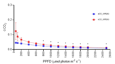 CO2 fixation quantum efficiency (ΦCO2) is calculated by dividing the rate of CO2 assimilation (adjusted for respiratory losses) by the rate at which quanta is absorbed using gas exchange as mentioned in the method section, 3.2.10.
